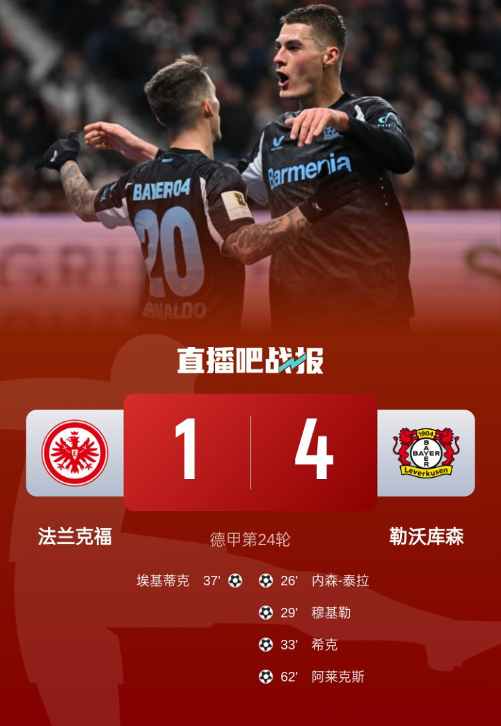 直播吧3月2日讯北京时间1:30,德甲第24轮法兰克福vs勒沃库森,比赛在德意志银行公园球场打响!上半场,勒沃库森7分钟内打进3球!内森-泰拉、穆基勒、希克破门,扎卡助攻+策动;随后穆基勒回传送礼,埃基蒂克扳回一球。下半场,阿莱克斯-加西亚世界波破门!